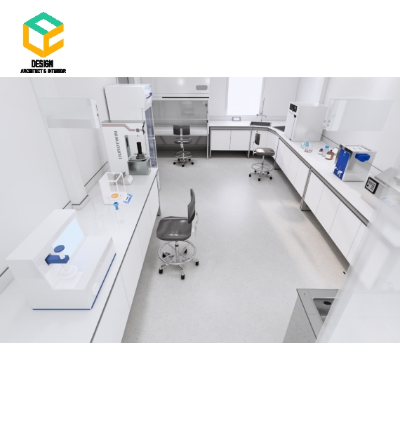 Không gian được thiết kế theo lối mở với hệ thống bàn thí nghiệm áp tường và module trung tâm, giúp tối ưu hóa diện tích thao tác cho kỹ thuật viên.