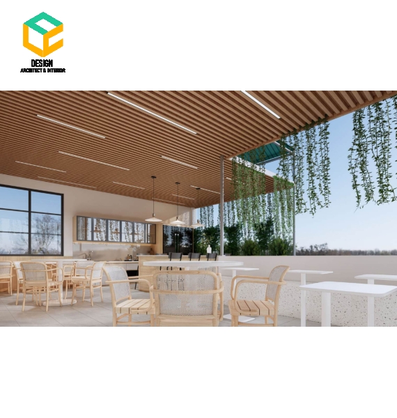 Hệ thống hút khí thải và điều hòa được xử lý ẩn trên trần thạch cao, giữ cho kiến trúc tổng thể luôn gọn gàng và hiện đại.